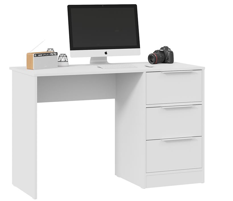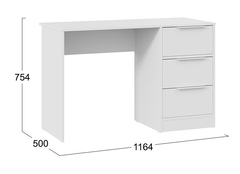 Стильный и минималистичный внешний вид стола создается благодаря белому фасаду и корпусу. Конструкция включает в себя три вместительных ящика для письменных принадлежностей, книг и учебников.